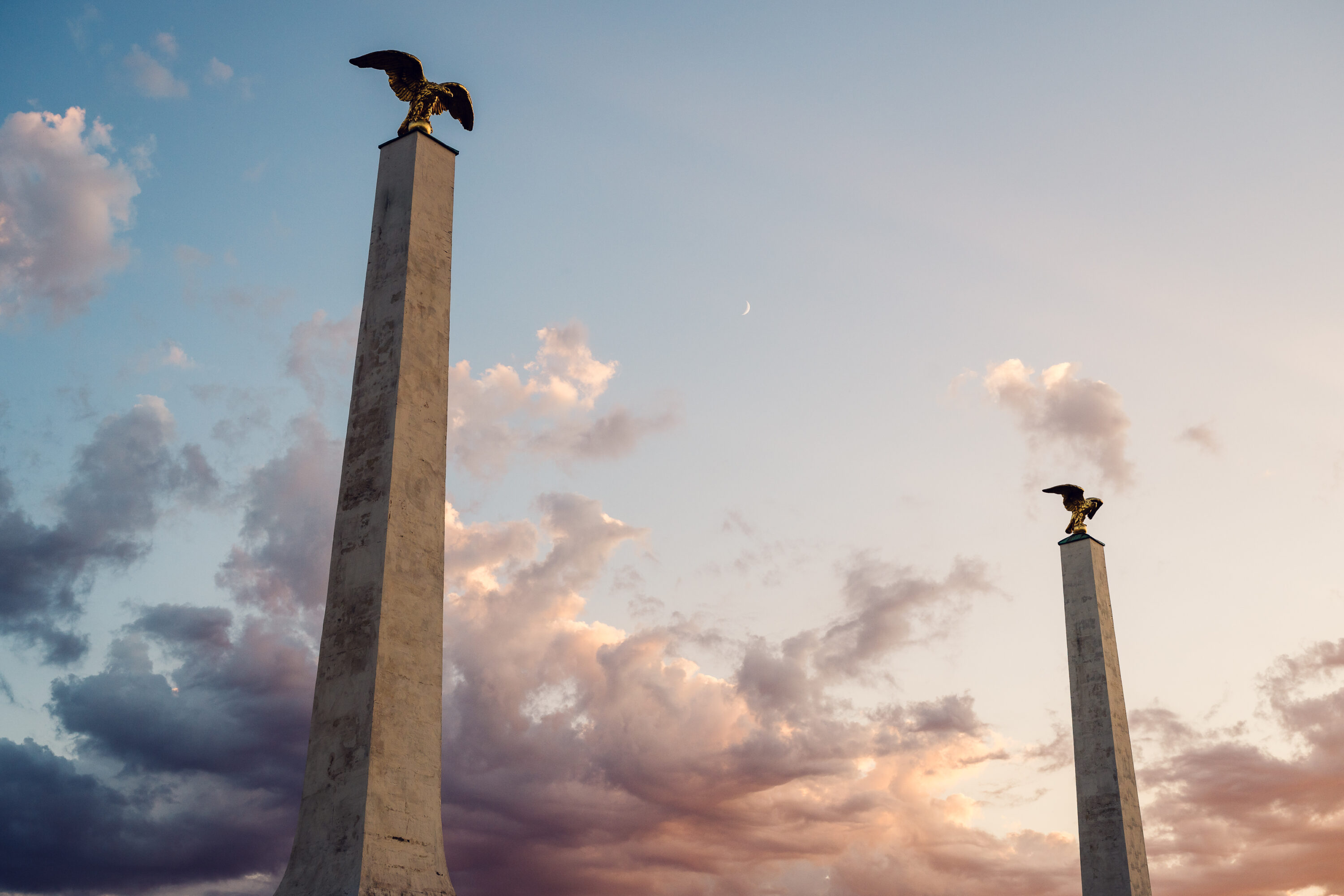 The central avant-corps is crowned by the sculpted double-headed imperial eagle and Habsburg-Lorraine coat-of-arms, projecting dynastic power above the entrance arches. Historically, this was the parade ground where imperial carriages and visiting dignitaries arrived, its geometry choreographed for maximum first-glance impact. Today, photographers can centre the façade while using the twin fountain basins and eagle-topped obelisk gate-piers as foreground anchors for balanced reflection shots.