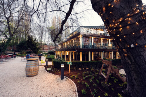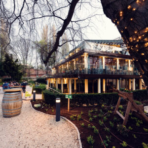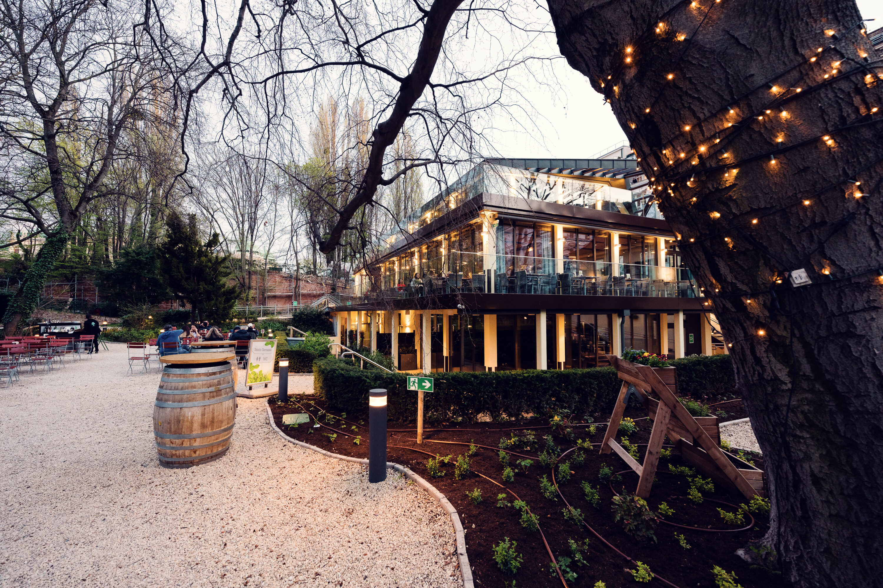 Sunset cocktails with wide city views in a sleek, Nordic inspired setting. Reach it in about 8-10 minutes through the Schweizergarten.
