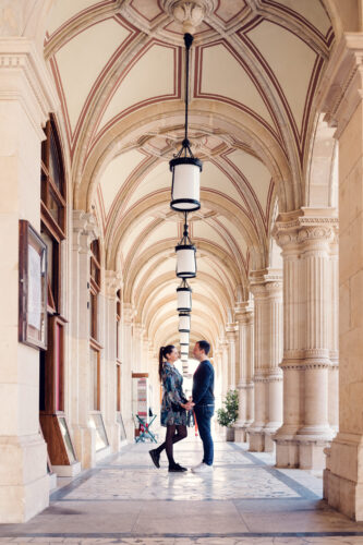 Portrait of Adriana and Mario at the majestic columns of the Vienna State Opera, capturing timeless elegance.